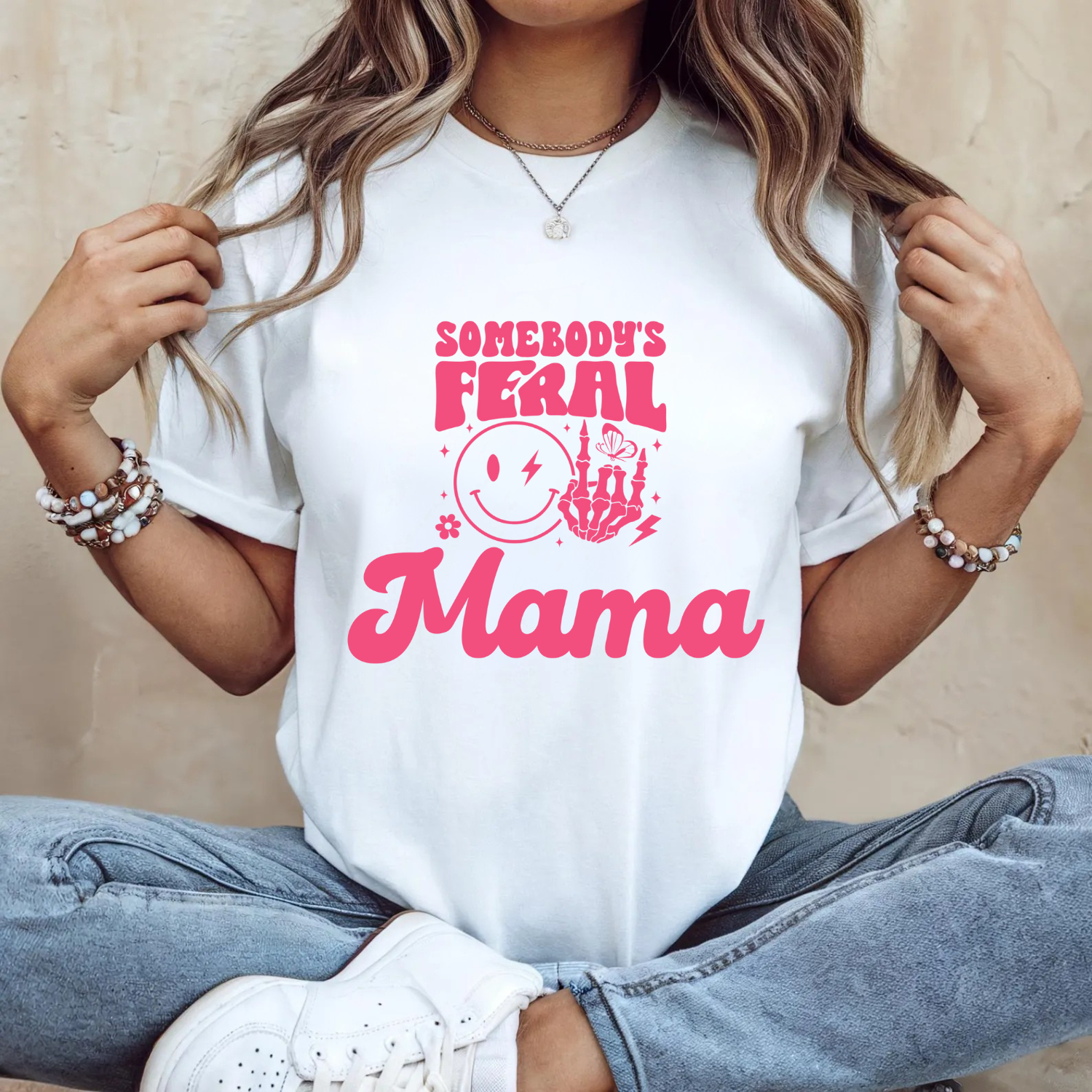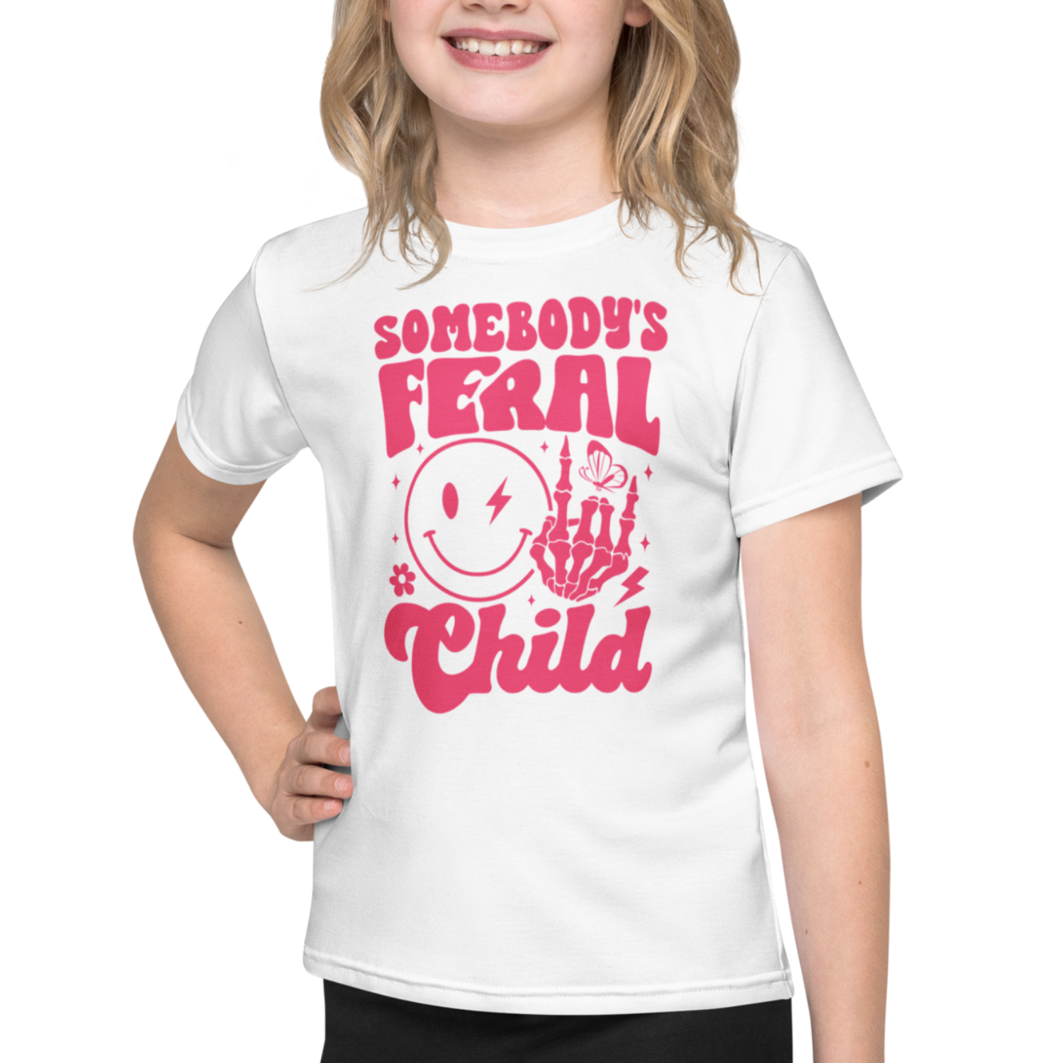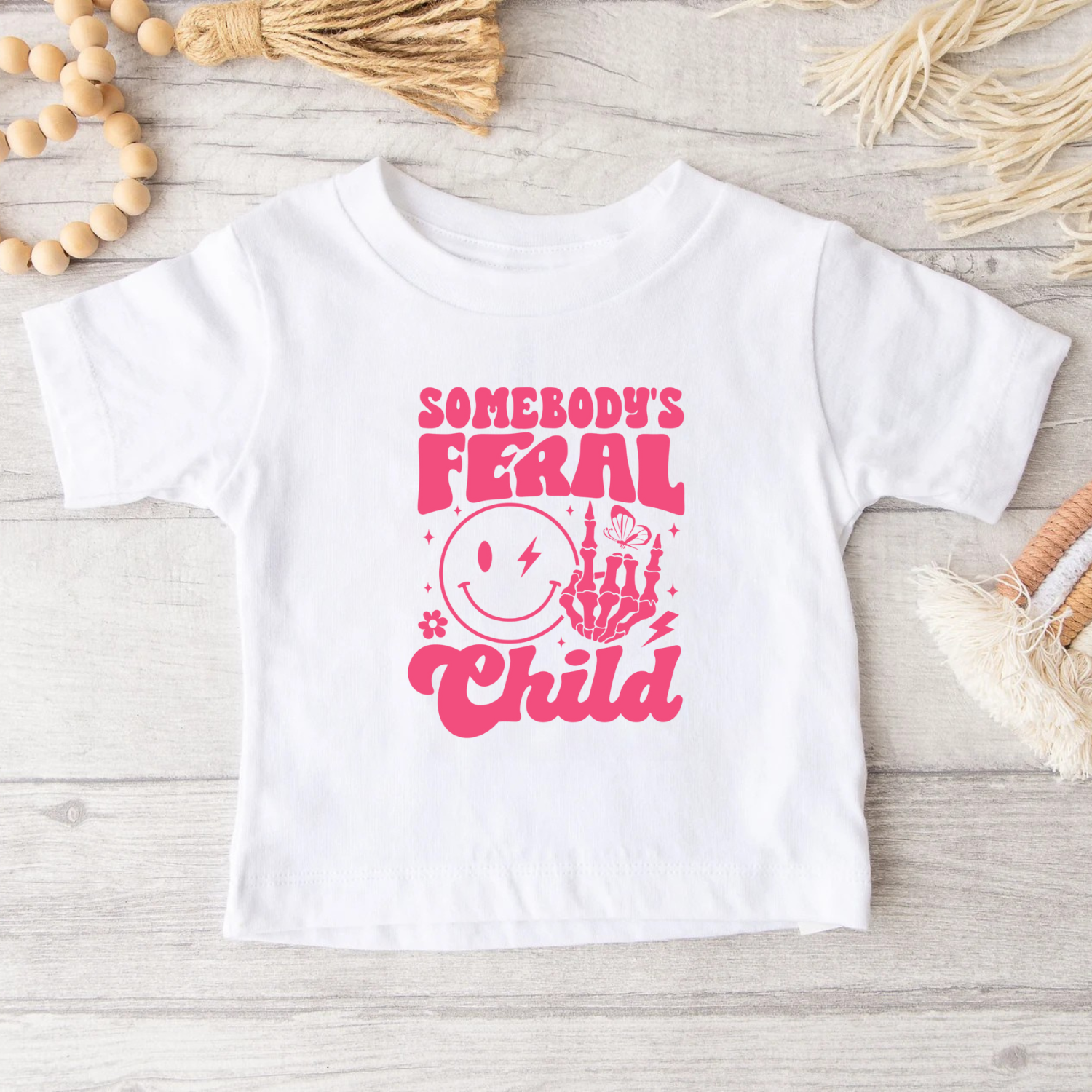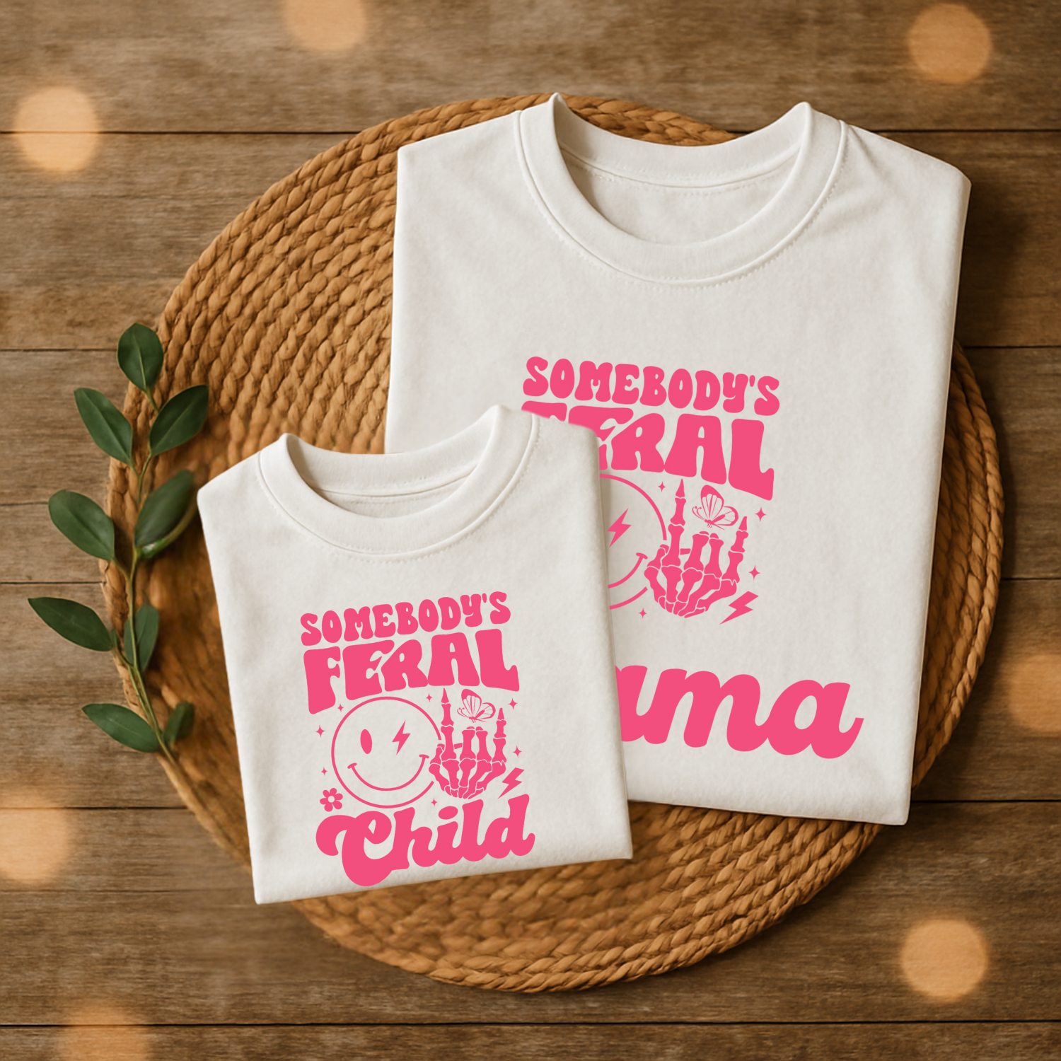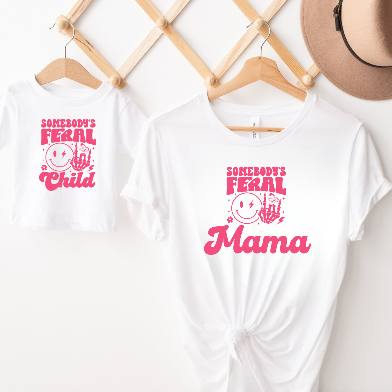 This matching Somebody’s Feral Mama and Somebody’s Feral Child t-shirt set is made for moms and their little rebels. Featuring playful pink graphics with a lightning bolt smiley, skeleton hand, and retro script, this set is perfect for mums who embrace chaos in style